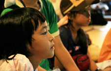 まずは写真を見ながら目と心をオープンにして発見のトレーニングをします。写真表現とせんせいの解説コメントで思ったことを発言したり、最初は落ち着きがなくてもだんだんと集中していきます。 |